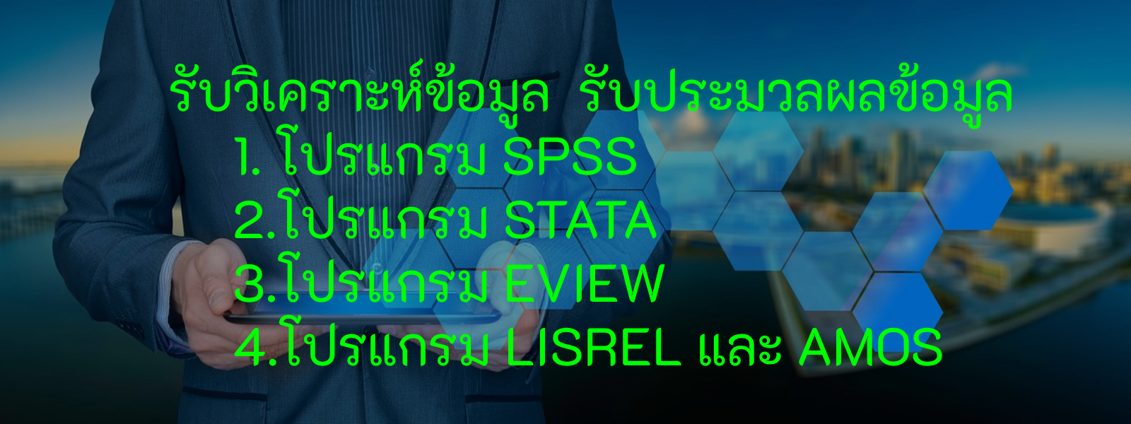 การวิเคราะห์ข้อมูลด้วยโปรแกรม SPSS STATA EVIEW AMOS และ LISREL เป็นอีกหนึ่งเครื่องมือที่สำคัญที่สุดสำหรับการวิเคราะห์ข้อมูลเชิงปริมาณ เพื่อนำไปสู่การอธิบายปรากฎการณ์ความสัมพันธ์ระหว่างตัวแปรที่กำหนดไว้ในสมมติฐานและกรอบแนวคิด